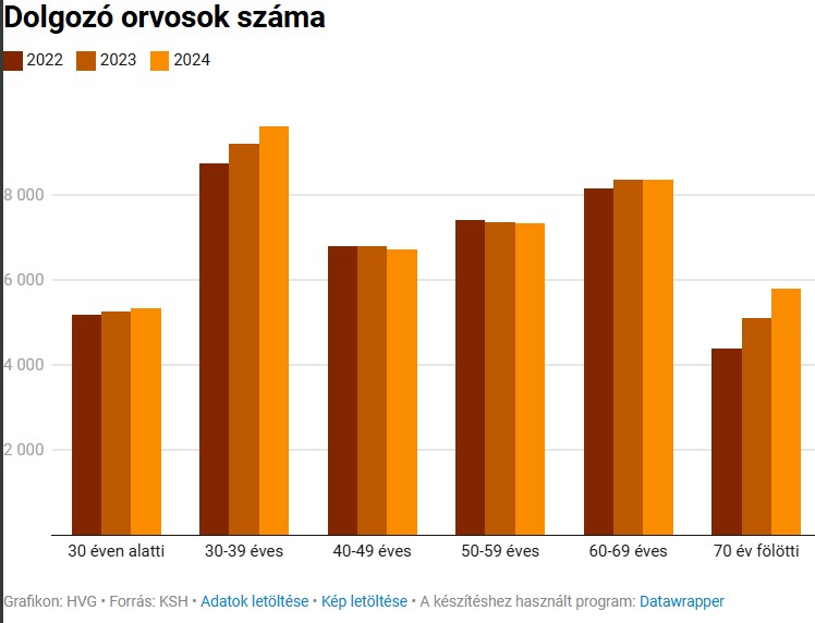 Pozitívum, hogy a huszonéves, illetve a harmincas orvosok száma is emelkedik. A 40-59 éveseknél viszont ha nem is drámai mértékben, de csökken a létszám. Úgy tűnik, amíg fiatalon még lelkesen vállalják sokan a munkát, túl a negyvenen már többen hagyják el a pályát vagy az országot, aki pedig már majdnem a teljes aktív életét ebben a szakmában dolgozta le, az nyugdíjba sem szívesen megy.